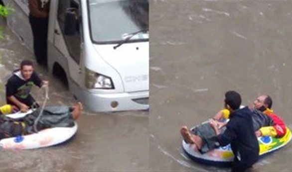وما دفع هذا الرجل إلى السباحة بتلك الطريقة هو حدوث شلل فى الحركة المرورية بالشوارع وغرق السيارات بعد ارتفاع مستويات المياه.تداول رواد موقع التواصل الإجتماعى "فيسبوك"، مقطع فيديو طريفاً يرصد عبور مواطن إسكندرانى لأحد الشوارع فى منطقة "فيكتوريا" مستعينا بــ"عوامة" بعدما غرقت بمياه الأمطار الغزيرة وسط الطقس السيئ الذى ضرب محافظة الإسكندرية اليوم.