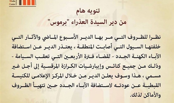واشار الدير فى بيانه الى أنه فى حال عودة الدير لاستقبال الاباء الكهنة سوف يتم الاعلان من خلال المركز الاعلامى للكنيسة القبطية الارثوذكسية.