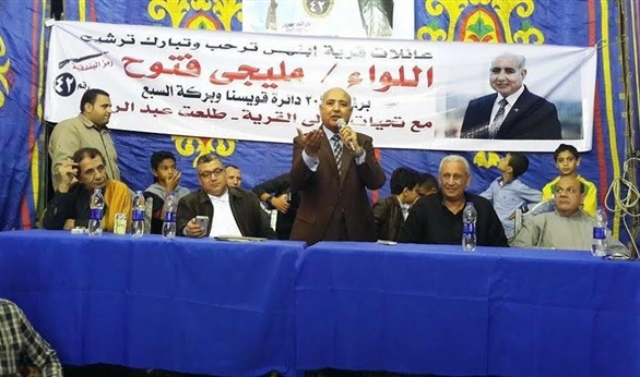 يشار إلى ان "شيخ العرب" اللواء مليجي فتوح هو مرشح فردى مستقل لمجلس النواب عن دائرة بركة السبع وقويسنا وهو من مواليد محافظه المنوفية كفور الرمل مركز قويسنا.