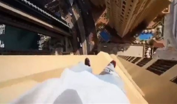 تداول رواد "فيس بوك" مقطع فيديو صادم، يظهر مغامر وهو يقفز بين أعمدة برج فى مدينة دبي، من الطابق رقم 43، ويظهر المغامر وهو يقفز بحرية تامة بين أعمدة البرج مثبتاً كاميرا أعلى رأسه ليدون هذه الفعلة الجنونية، والتى حصدت مشاهدات كثيفة عبر "فيس بوك".