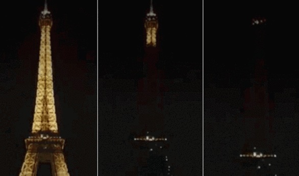 وتم إطفاء أنوار البرج واختارت معالم أخرى حول العالم ارتداء ألوان العلم الفرنسي كتعبير عن تضامن شعوب دول كثيرة مع فرنسا في مصابها.