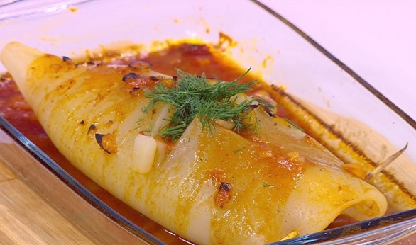 -احشي الكاليمارى بالأرز و اغلقيه من الجانب بعيدان الخشب ضعيه فى طاسة على النار لمدة 4 دقائق ثم ادخليه الفرن مغطي بصوص الطماطم لمدة 5 دقائق ويقدم.