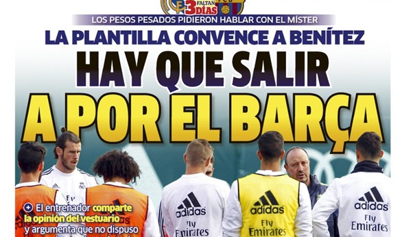 صحيفة ماركا: "اللاعبين يبحثون عن إقناع بينيتيز.. يجب الفوز على البارسا.. بينيتيز يفكر في الخطط وحتى الآن لم يمتلك الفريق بالكامل.. ثلاثة أيام على الكلاسيكو".