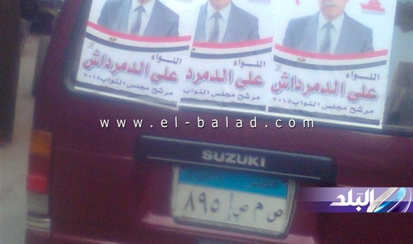 وقام المرشح بتعليق صوره على السيارات فى إطار الدعاية الانتخابية فى مخالفة صريحة لقرارات اللجنة العليا للانتخابات التى تتعلق بالصمت الانتخابى فى يومى الانتخابات.