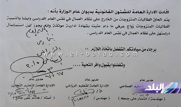 يذكر أنه أرسلت الادارة المركزية للتعليم الفني بوزارة التربية والتعليم، فاكسا رسميا إلى مديري مدارس التعليم الفني، يوصي بأن يتم إلحاق الطالبات المتزوجات من الخارج على نظام العمال في نفس العام الدراسي.