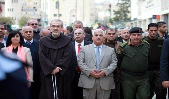 وقال حارس الأراضي المقدسة إنه 'رغم ما تمر به الأراضي الفلسطينية إلا أننا يجب ان نتسلح بإرادة وعزيمة قويتين، وان نفرح بأعياد الميلاد، سنصلي من اجل احلال السلام ووقف سفك الدماء'.