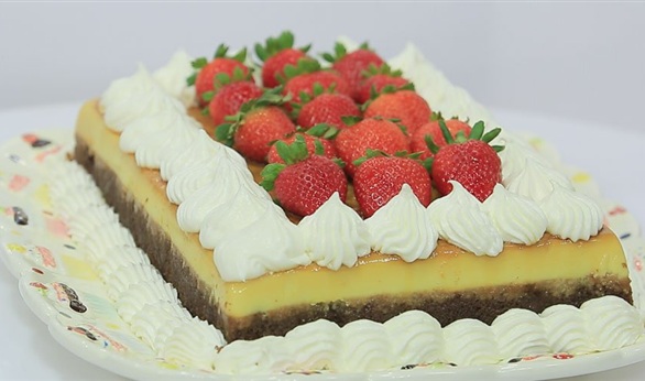 -ادخلي القالب الفرن على حمام ماء و بعد تمام التسوية ادخليه الثلاجة لمدة ساعتين.