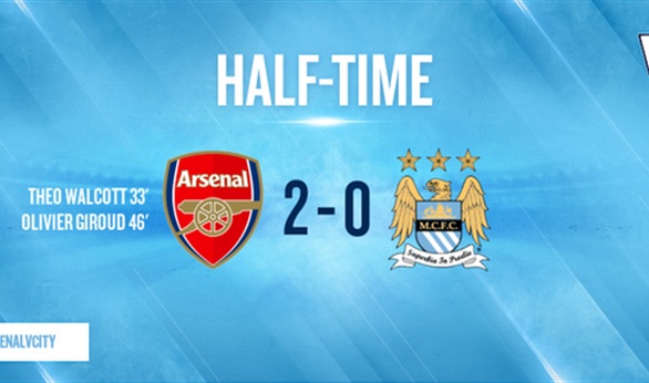 انتهى الشوط الأول من مباراة آرسنال ومانشستر سيتى المقامه حالياً على ملعب الإمارات، ضمن منافسات الجولة السابعة عشر من بطولة الدورى الإنجليزى الممتاز لكرة القدم , بتقدم أصحاب الأرض بهدفين نظيفين.