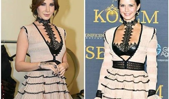 تداول عدد من مستخدمي موقع فيس بوك صورة للفنانة اللبنانية نانسي عجرم وأخرى للنجمة التركية بيرين سات تكشف عن ارتداء كل منهما نفس الفستان.