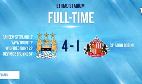 سحق مانشستر سيتى نظيره سندرلاند بأربعة أهداف مقابل هدف واحد فى المباراة التى أقيمت اليوم السبت على ملعب الإتحاد , ضمن منافسات الجولة الـ18 من بطولة الدورى الإنجليزى الممتاز لكرة القدم " البريمير ليج " .