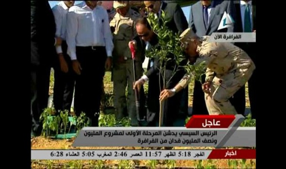 غرس القائد الأعلى للقوات المسلحة الرئيس عبد الفتاح السيسى "شجرة"، بمنطقة الفرافرة بالوادي الجديد، إيذانا ببدء تنفيذ مشروع استصلاح مساحة مليون ونصف المليون فدان.