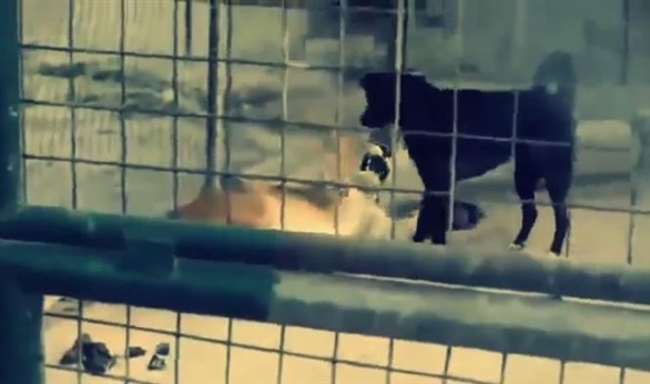تمكن كلب بلدى من فرض سيطرته على اسدين وقام بتنويمهما على الارض وبدأ عليهم الاستسلام التام لرغابات الكلب.
