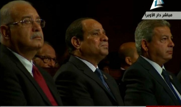 وبمجرد سماع الرئيس عبد الفتاح السيسي، ورئيس الوزراء المهندس شريف إسماعيل، ووزرير الشباب والرياضة خالد عبد العزيز، تلك الكلمات ظهرت عليهم علامات البكاء، مما اضطر مخرج الاحتفالية لتغيير الكادر مسرعا.