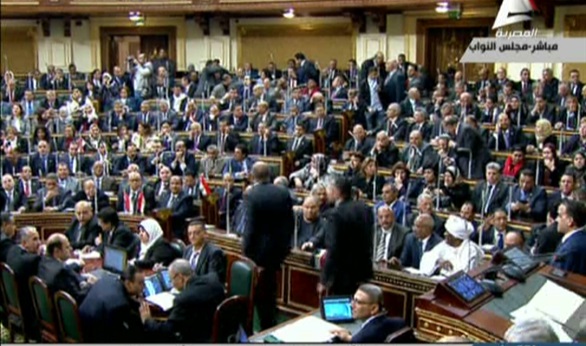 تبادل نواب البرلمان المصري الجديد التهنئة والتحية عقب دخولهم قاعة البرلمان في جلسته الإجرائية، واتخذ كل منهم مقعده استعدادا لبدء الجلسة.