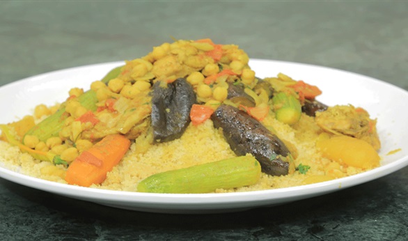 -ضيفي المرقة واتركيه لينضج على نار هادئة قدمي الكسكسي وعليه الخضروات وقطع الدجاج.