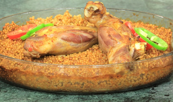 -ضعي المغربية في طاسة على النار مع قليل من الزيت لتحمر مع مكعب مرقة وكمون وملح وفلفل.