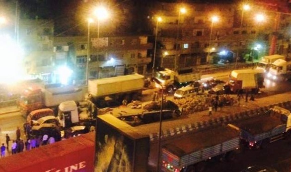 سقطت منذ قليل سيارة نقل تريللا من اعلي الطريق الدائري فوق موقف المنيب لتهشم سيارة ميكروباص وأخري بيجو، وسقط عدد من القتلي تتراوح أعدادهم بين 7 الي 10 وإصابة العشرات.