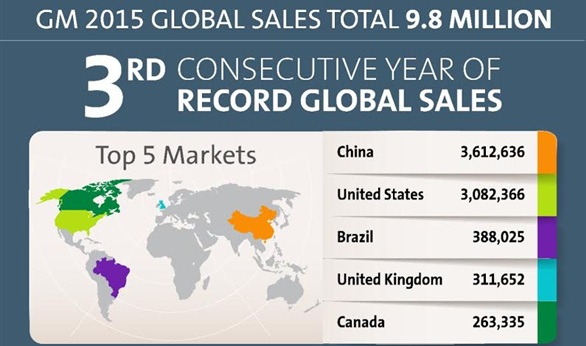 للعام الثالث على التوالى، حققت شركة جنرال موتورز أرقام مبيعات متميزة فى 2015 بلغت إجمالي 9,8 مليون سيارة، وذلك بارتفاع بمعدل 0.2% لنتائج المبيعات القياسية التى تحققها الشركة للعام الثالث على التوالى.