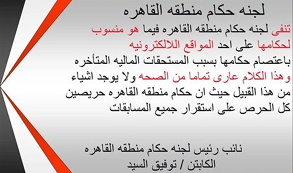 نفى مسئولو اللجنة الفرعية للحكام بمنطقة القاهرة وجود أى نية لدى قضاة الملاعب التابعين إلى المنطقة للاعتصام ضد اتحاد الكرة بسبب المستحقات المالية المتأخرة.