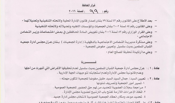 وشمل القرار الذى حمل رقم 99 لسنة 2016 تعيين جمال السيد خليل مفوضا للجمعية لتكون مهمته تسيير أمور الجمعية وتصريف شئونها ومراجعة سجلات العضوية لتحديد من لهم حق الحضور للجمعية العمومية واتخاذ الإجراءات اللازمة لفتح باب الترشيح لعضوية مجلس الإدارة وتحديد موعد ومكان انعقاد الجمعية العمومية لانتخاب مجلس إدارة جديد.