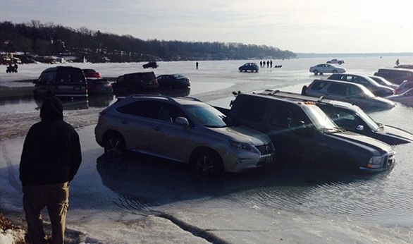 غرقت أكثر من 20 سيارة في بحيرة بولاية ويسكونسن أمس السبت بعد أن وضع زائرون سياراتهم بالقرب من البحيرة المتجمدة.