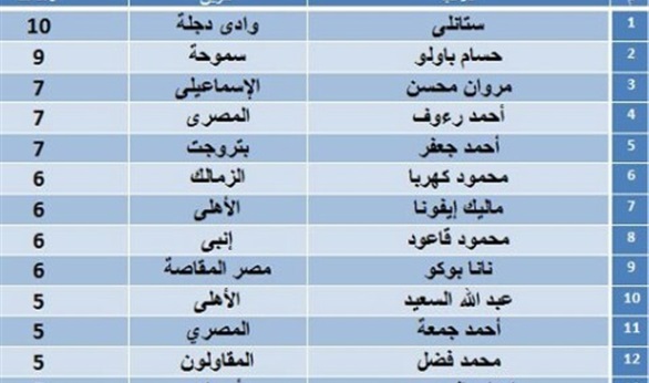 وسجل ايضا عبدالله السعيد لاعب الاهلى واحمد جمعه فى المصرى ومحمد فضل فى المقاولون العرب وايهاب المصرى فى اسوان 5 أهداف.