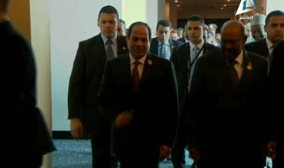 وظهر الرئيس السيسي، بصحبة الرئيس السوادني، عمر البشير، أثناء دخول الرؤساء إلى القاعة.