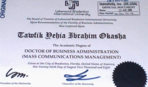 وأضاف "رفعت" أنه لم ير أحد شهادة الدكتوراه التى حصل عليها توفيق عكاشة، لافتا إلى أنه عرض شهادة دكتوراه من المفترض أنه حاصل عليها من جامعة أمريكية تدعى "ليكوود"، وهى جامعة لم نسمع عنها من قبل، وتم عمل بحث عن الجامعة فى ولاية فلوريدا، ولم يتم العثور على أى جامعة بهذا الاسم نهائي، سوى جامعة متخصصة فى الماساج والتجميل.