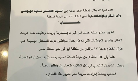 نائب الأسكندرية يتقدم بطلب إحاطة لوزير النقل لتطوير قطار أبو قير