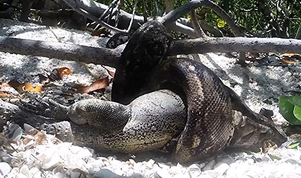 أظهرت لقطات فيديو محاولات ثعبان، يبلغ طوله حوالي 4 أمتار، ابتلاع سحلية ضخمة دفعة واحدة.