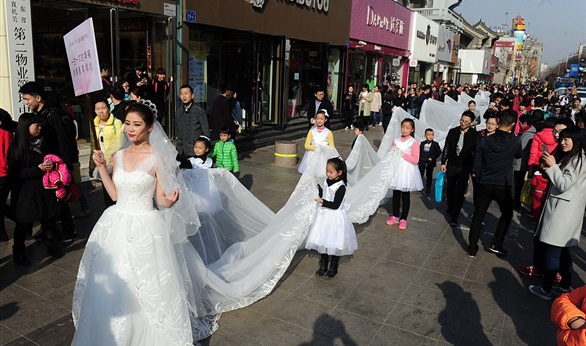 فوجئ أهالي قرية جينان الصينية بعارضة أزياء تتجول في شوارع قريتهم الواقعة شرقي مقاطعة شان دونج بفستان زفاف عليه أطول طرحة عروسة في العالم، ويبلغ طولها 331 قدما.