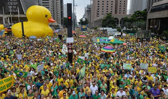 وقالت الشرطة إن 2500 شخص تظاهروا أمام القصر الرئاسي في العاصمة برازيليا فيما تدفق آخرون إلى ميدان باوليستا الرئيسي في ساو باولو. وقطع عشرات من مشرعي المعارضة جلسة للكونجرس ورددوا هتافات تطالب روسيف بالاستقالة.
