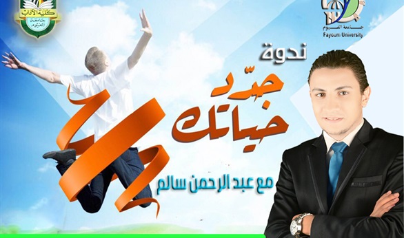تقيم كلية الآداب بجامعة الفيوم ندوة ذاتية تحت عنوان "جدد حياتك" بقاعة الاحتفالات بالكلية غدا الاثنين في تمام الساعة الواحدة ظهرا ، يحاضر الندوة الأستاذ عبد الرحمن سالم مقدم برنامج نقطة ومن أول السطر بقناة ABC العربية ومدرب بوزارة الشباب ببرنامج "علشان بكره"، مدير تحرير جريدة الأخبار المصرية" الطالب بقسم اللغة العربية.
