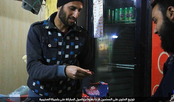 ونشر التنظيم صوراً تظهر الجهاديين وهم يوزعون الحلوى على سكان المناطق السورية الواقعة تحت سيطرته احتفالاً بالمجزرة الإرهابية التي شهدتها أوروبا.