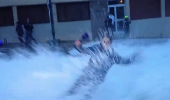 عرضت قناة روسيا اليوم مقطع فيديو لمذيعة بإحدى القنوات الفرنسية وهي تتعرض لموقف محرج أثناء تصوير برنامجها علي الهواء أمام الكاميرا وسط أمواج في البحر، حيث أرتفعت الأمواج وأطاحت بالمذيعة أثناء تصوريها وسقطت أرضا علي ظهرها، ثم أسرع إليها زملائها ليطمئنوا عليها.