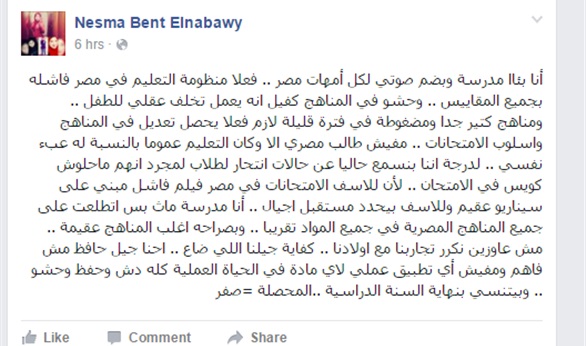 وأوضحت "النبوى" عبر موقع التواصل الاجتماعي "فيس بوك" ، أن منظومة التعليم في مصر فاشلة بجميع المقاييس ، لافتةً إلى أن الحشو الموجود في المناهج كفيل بأن يصيب تلاميذ الابتدائي بالتخلف العقلي .