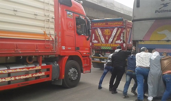 وقام ركاب الأوتوبيس للنزول فى محاولة منهم لإعادة تشغيله مرة أخري بعد أن تعطلت مصالحهم.