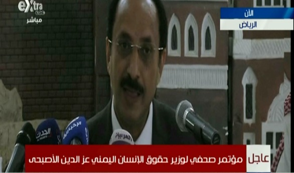 قال وزير حقوق الانسان اليمني عز الدين الأصبحي، إن اليمن لا يزال يشهد العديد من الانتهاكات من قبل قوات الحوثيين،مشيرا إلي أنه لولا عمليةعاصفة الحزم والأمل العام الماضي لكانت الانتهاكات أكثر بكثير.