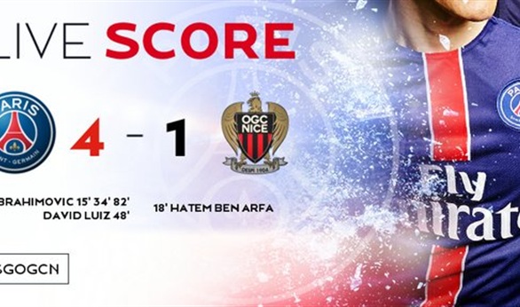 أحرز السويدي زلاتان إبراهيموفيتش ثلاثة أهداف "هاتريك" ليقود باريس سان جيرمان إلى فوز كبير 4 / 1 على نيس في المرحلة الـ 32 من الدورى الفرنسى.