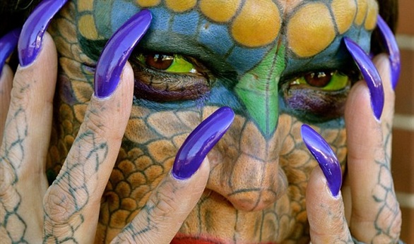 نشرت صحيفة "ديلي ميل" البريطانية مجموعة من الصور الصادمة تظهر سيدة أمريكية تدعى "ايفا تياماتا ميدوزا" 55 عاماً تقيم فى ولاية "أريزونا" الأمريكية، قررت أن تتحول إلى تنين، فقطعت أذنيها وعدلت شكل أنفها لتصبح على شكل التنين، ولتصبح أكثر رعباً صبغت بياض عينيها بالأخضر، ونقشت رسوما كالحراشف على صدرها وذراعيها، وذلك ضمن عدد من عمليات التجميل على مراحل.