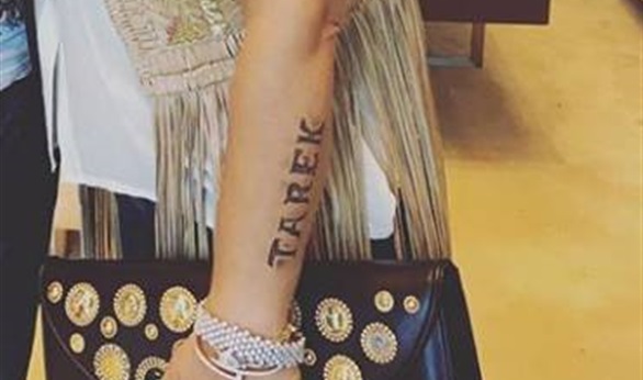 وظهر التاتو يحمل اسم زوجها الخرج طارق العريان مكتوبا باللغة الإنجليزية.
