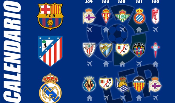 ورصدت صحيفة "ماركا" الإسبانية الجولات الخمس المتبقية من الليجا للثلاثي المتصارع على الصدارة حيث يتبقى لبرشلونة 3 مباريات خارج ملعبه ومباراتان على أرضه ووسط جماهيره، ونفس الأمر يحدث لريال مدريد (3 مباريات خارج الديار ومباراتان على ملعبه)، في المقابل يتبقى لأتلتيكو 3 مباريات على ملعبه "فسينتي كالديرون" ومباراتان فقط خارج ملعبه.