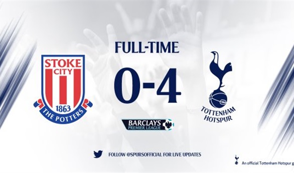 سحق توتنهام هوتسبير مضيفه ستوك سيتى برباعية نظيفة فى المباراة التى جرت اليوم الإثنين على ملعب بريطانيا , ضمن منافسات الجولة الـ34 من بطولة الدورى الإنجليزى الممتاز لكرة القدم .