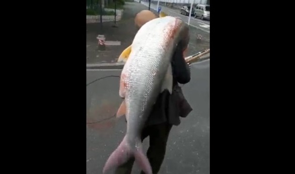 بالفيديو.. رجل يحمل سمكة ضخمة ويتجول بها في الشارع
