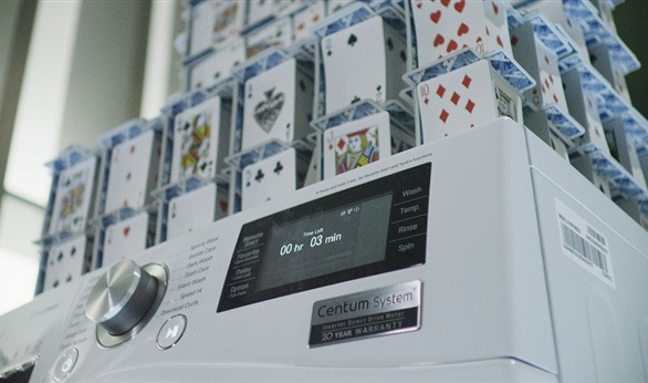 بالفيديو.. منزل من أوارق «الكوتشينه» يدخل موسوعة جينيس بعد صموده فوق غسالة في حالة دوران