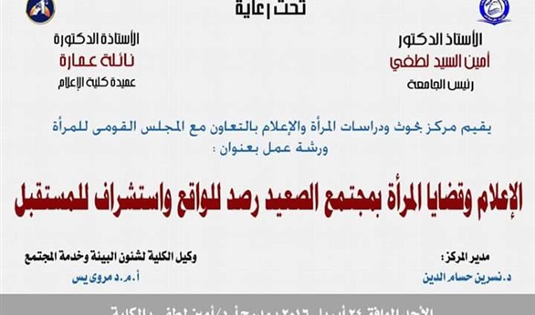 ينظم مركز بحوث ودراسات المرأة والإعلام بكلية الإعلام جامعة بني سويف برعاية الدكتور أمين لطفي رئيس الجامعة و الدكتورة نائلة عمارة عميد كلية الإعلام بالجامعة بالتعاون مع فرع المجلس القومي للمرأة ببني سويف ورشة عمل بعنوان " الإعلام وقضايا المرأة بمجتمع الصعيد رصد للواقع واستشراف المستقبل"، غدا الأحد بمدرج الأستاذ الدكتور أمين لطفي بكلية الإعلام، بحضور الإعلامية الدكتورة درية شرف الدين وزير الإعلام الأسبق والدكتورة عزة عبدالعزيز رئيس قسم الإعلام بسوهاج والإعلامي دكتور محمد سعيد محفوظ.