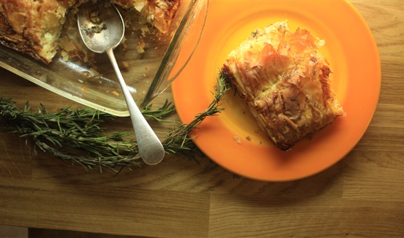 - يدهن قالب فرن مستطيل عميق، بقليل من الزبد، يفرد ورقة من الجلاش، بحيث تلامس الوعاء من الداخل، وتدهن بقليل من الزبد، تكرر العملية للحصول على طبقة من 5 ورقات جلاش.