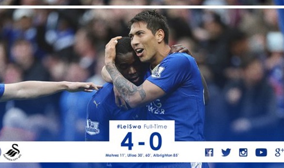 واصل ليستر سيتي زحفه نحو لقب البريميرليج بفوز مهم على ضيفه سوانزى سيتي بنتيجة 4-0 بالمواجهة التى جرت على ملعب ووكرز ستديوم فى اطار مباريات الجولة 35 من عمر الدورى الانجليزي الممتاز.