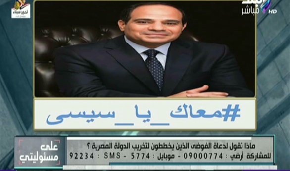 وقال «موسى» خلال تقديمه برنامج «على مسئوليتي» المذاع على قناة «صدى البلد»، إن هاشتاج «#معاك _يا _سيسي» من المتوقع أن يتصدر مواقع التواصل الاجتماعي، والجميع يعمل عليه الآن، موضحا أنه سيتابع الهاشتاج أول بأول ويعرضه على المشاهدين.