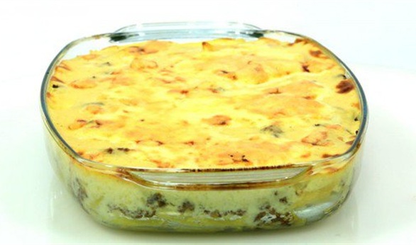 - نضع المكرونة فى صينية ونضيف عليها اللحمة المفرومة ونضيف عليه البشاميل.